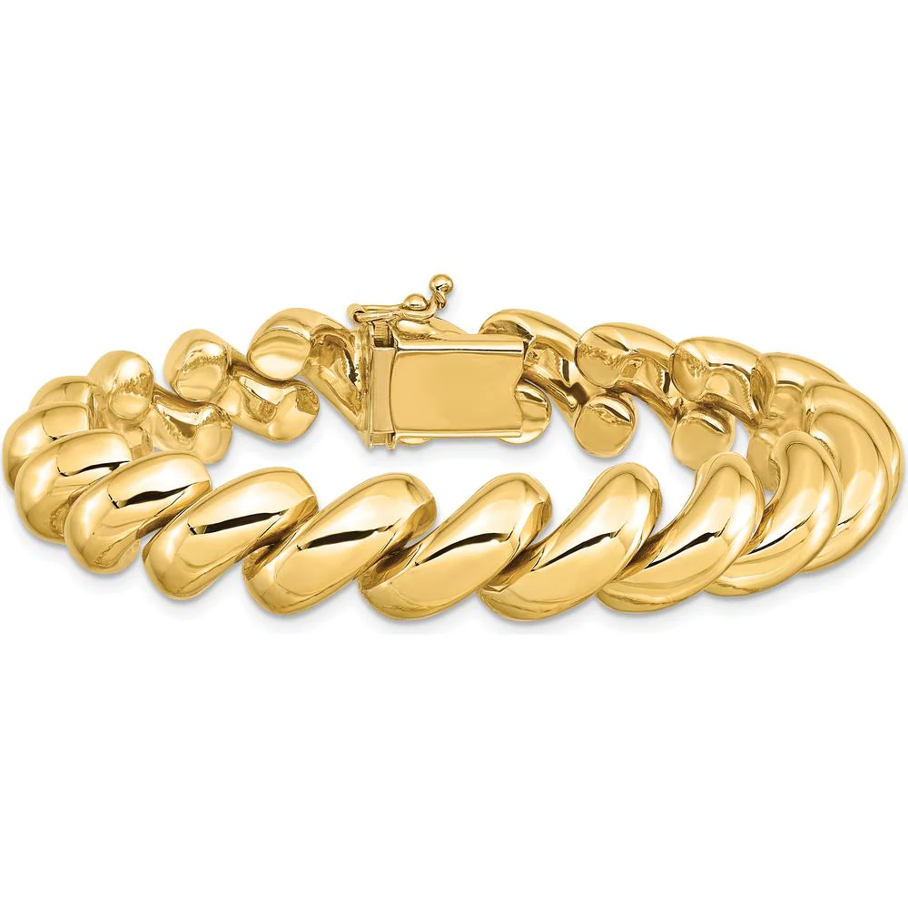 Quiet shimmer, lasting impression... The 14K Polished 12mm 8" San Marco Bracelet is an effortlessly elegant piece, designed to turn heads and elevate your look with every movement. Crafted from 14K yellow gold, this bracelet boasts a striking San Marco chain style, where each polished link exudes a smooth, refined finish. The 12mm width of the links makes a bold statement, showcasing both strength and sophistication. With a solid, box clasp connector, this bracelet stays securely in place, ensuring you can wear it with confidence whether you're heading to a gala or enjoying an evening out.
